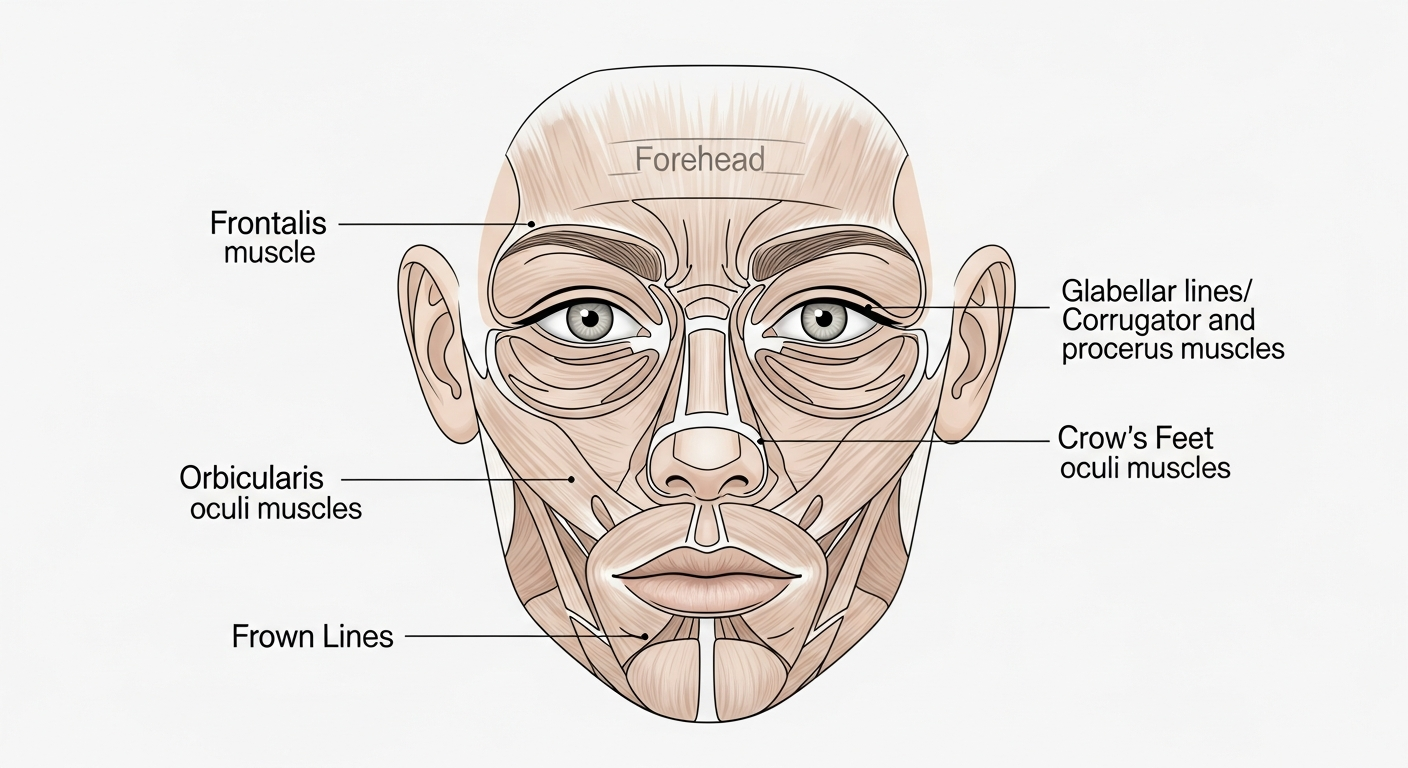 Age:Horizontal wrinkles over the forehead are caused by action of the forehead muscle that raises the eyebrow (frontalis). Relaxing this muscle with Botox gives a smooth and ironed out forehead